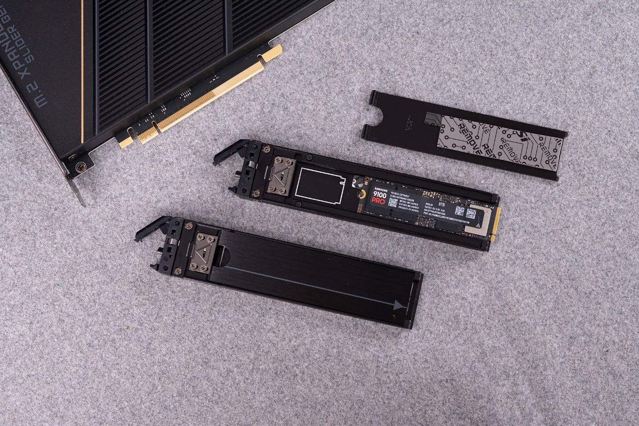 不过它对有一定的兼容性,普通版本的固态硬盘能够轻松安装进扩展卡内,并且散热配置相当离谱,不仅有导热垫还自带涡轮散热,非常顶!