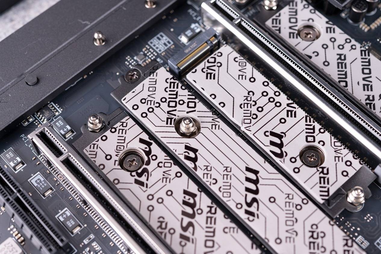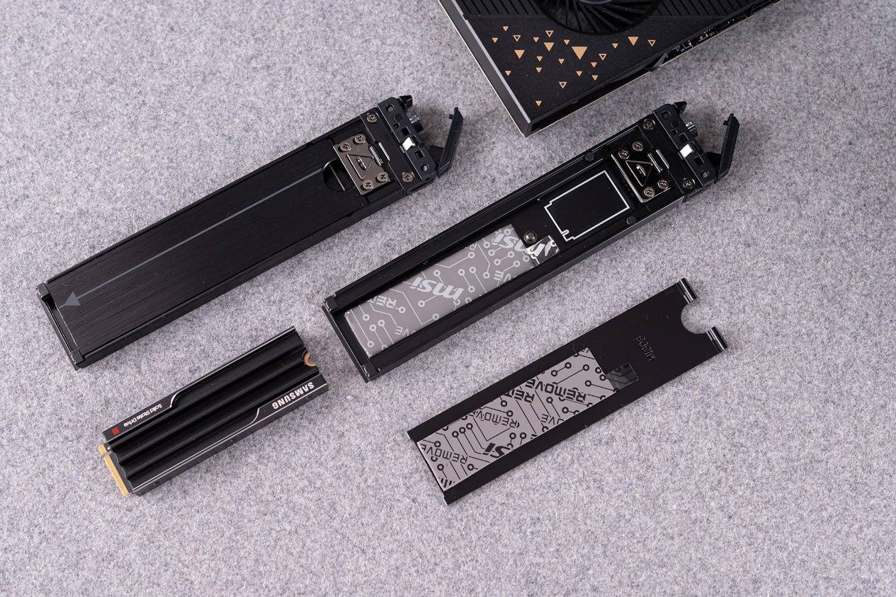 固态硬盘的安装也升级了快拆设计,微星称其为EZ M.2 Clip II 无螺丝安装设计,安装时直接把M.2固态硬盘对应好后,按上即可卡住,而拆卸仅需要向左轻轻一按即出来。