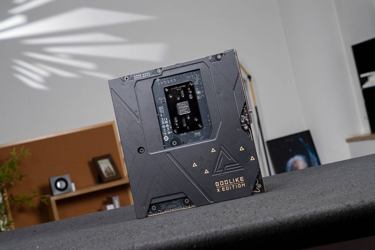来到主板背面,X870E 超神依旧配有大面积的金属背板,增强主板强度的同时,也让整块主板的风格更加统一:右下角同样有MEG系列的三角标志,同时还有GODLIKE X EDITION的专属标识,并且背板全部都做了磨砂表面处理。