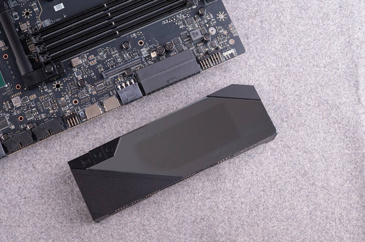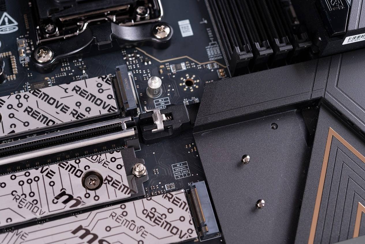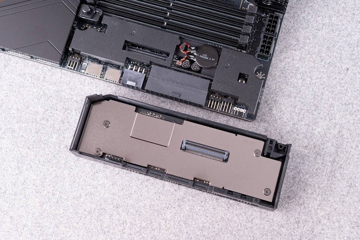 至于散热部分,所有的M.2插槽里,最顶部的拥有独立的散热装甲,前方有快拆设计,摁住弹片即可拆卸下来;同时尾部还有个磁吸接口,用来连通装甲上的ARGB灯。