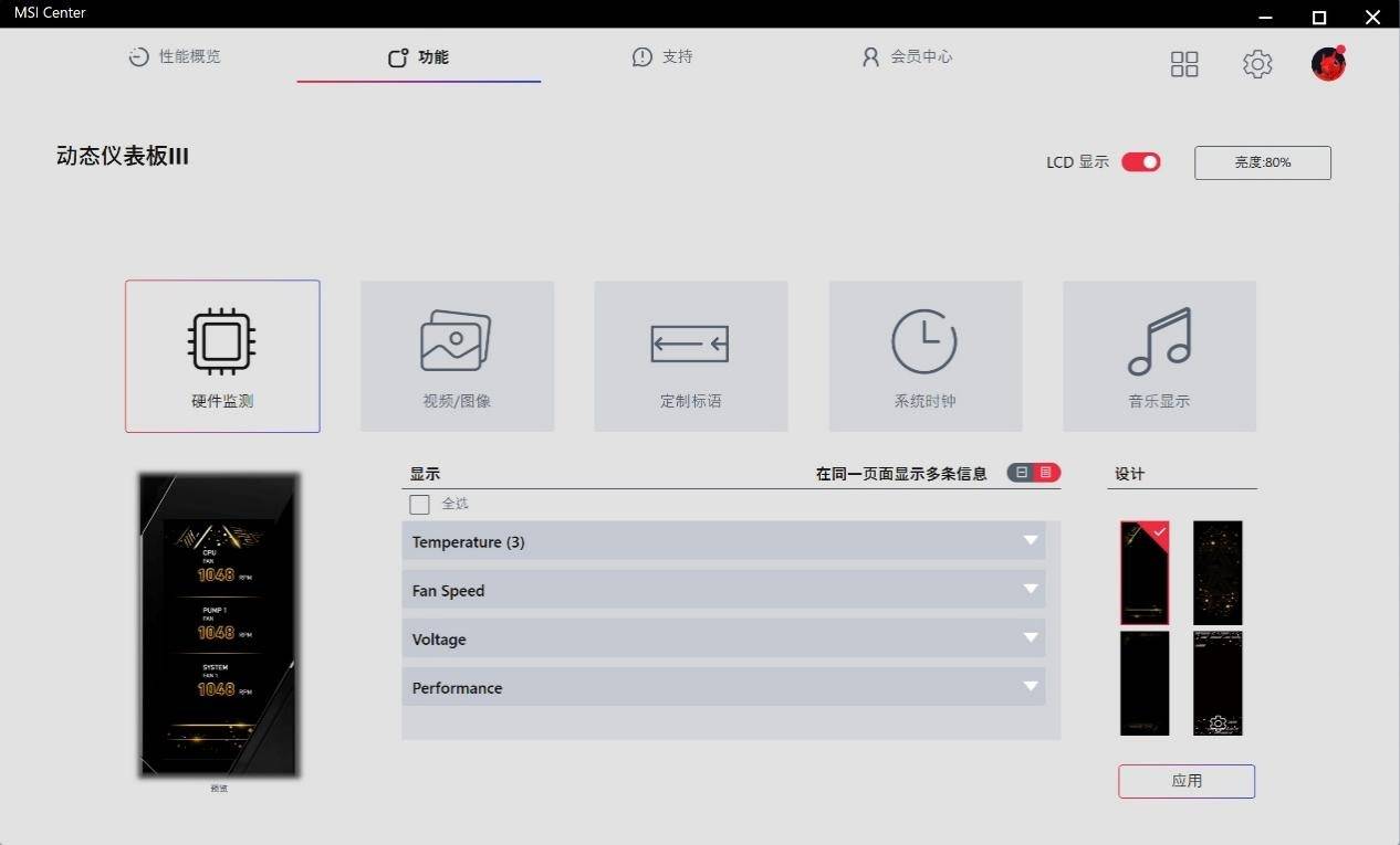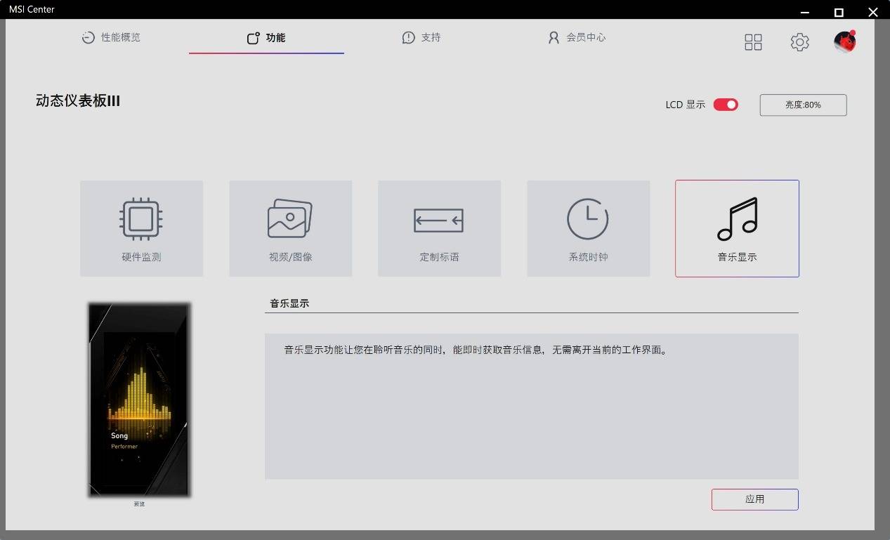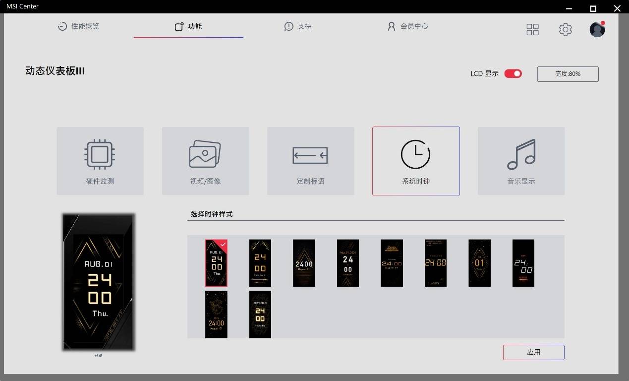 除此之外,MSI Center内的玩法也非常丰富,可以显示时间甚至是进行音乐律动展示。用户可以根据自己的喜好来选择显示的内容,完成设置后点击“应用”按钮,面板就会显示设置好的对应内容。