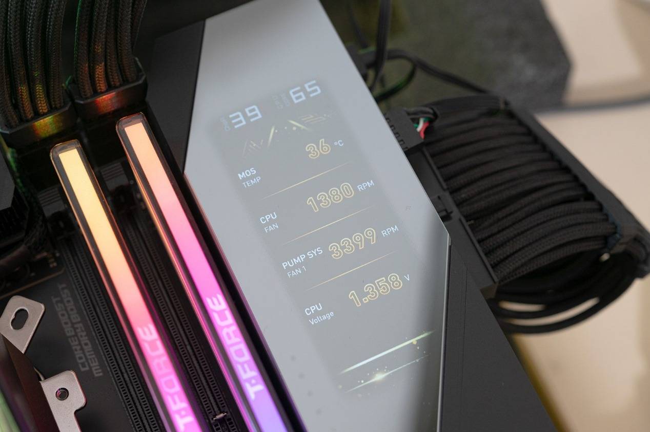 这款主板的第三代龙魂动态面板是一块3.99 吋LCD屏幕,既能实时显示硬件参数信息,支持硬体监控、故障排除、BIOS 更新等功能,还能进行个性化调节,自由调节显示界面。
