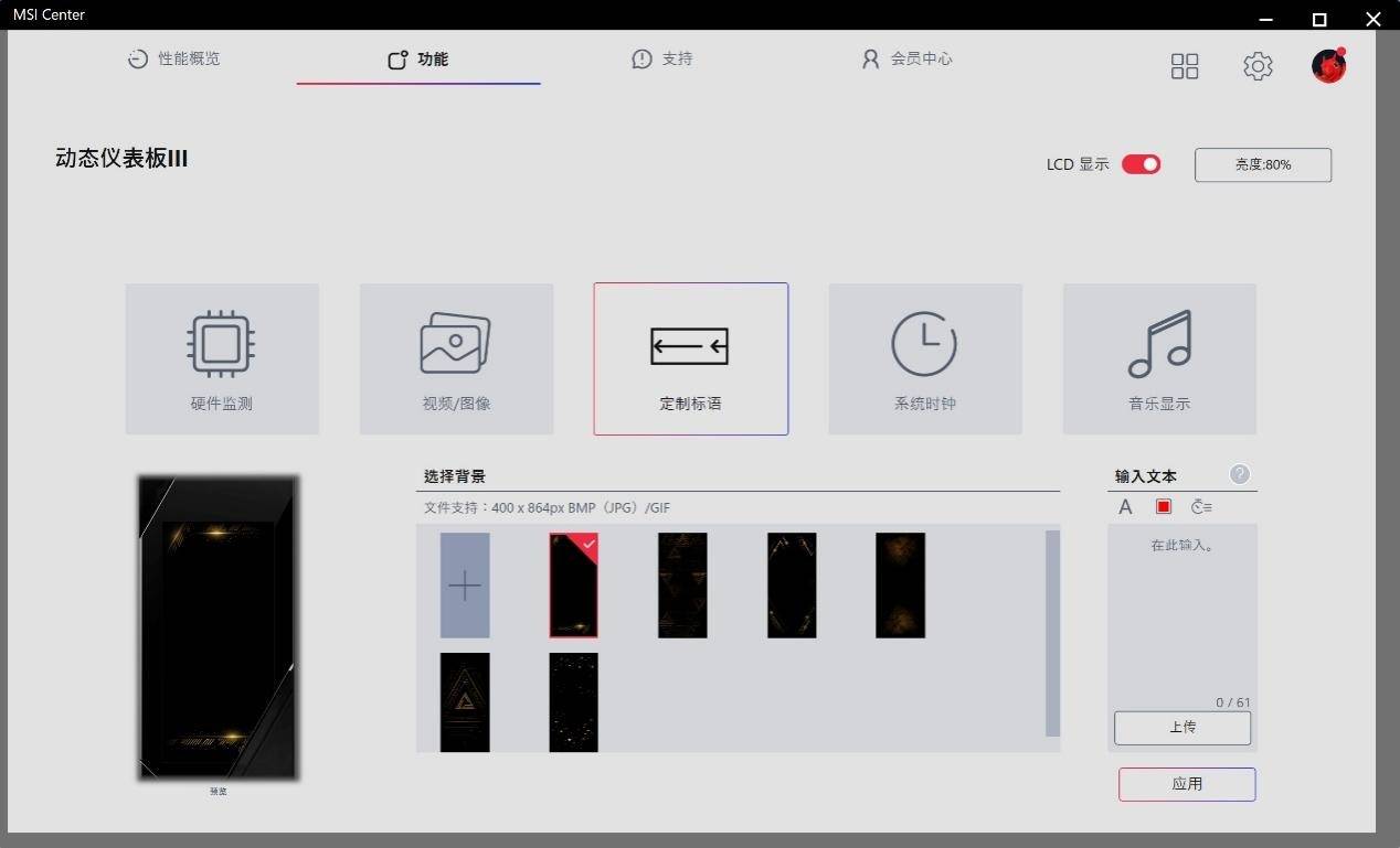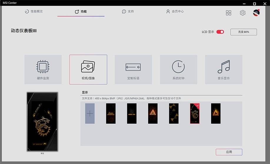 例如在MSI Center中能够让这块屏幕显示自己心仪的图片或视频。