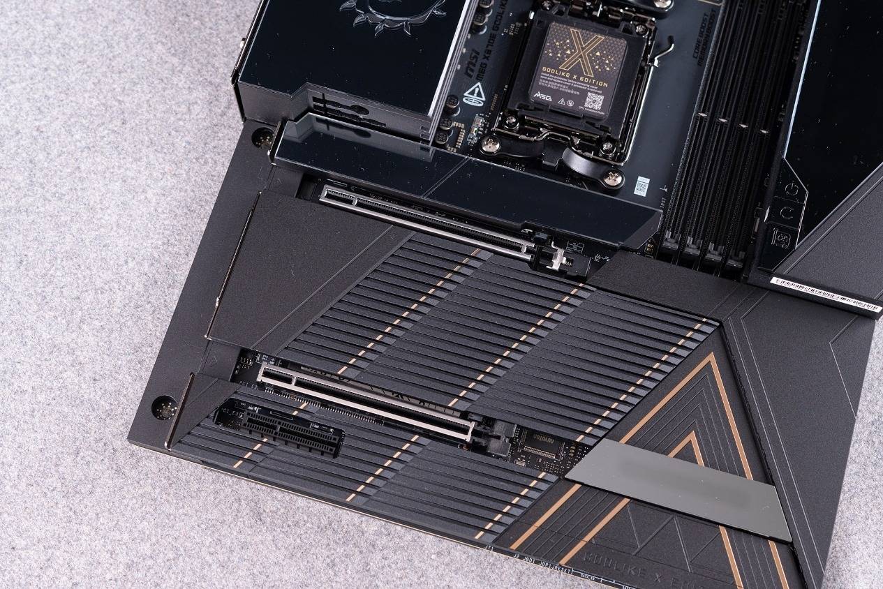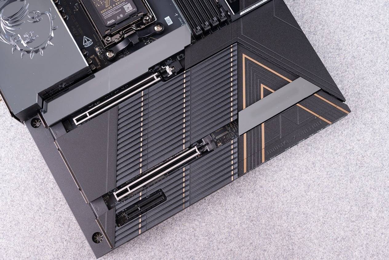接下来我们视线继续往下,微星MEG X870E GODLIKE X EDITION超神配备了3条PCIe插槽,其中两条支持PCIe 5.0,一条支持PCIe 4.0。