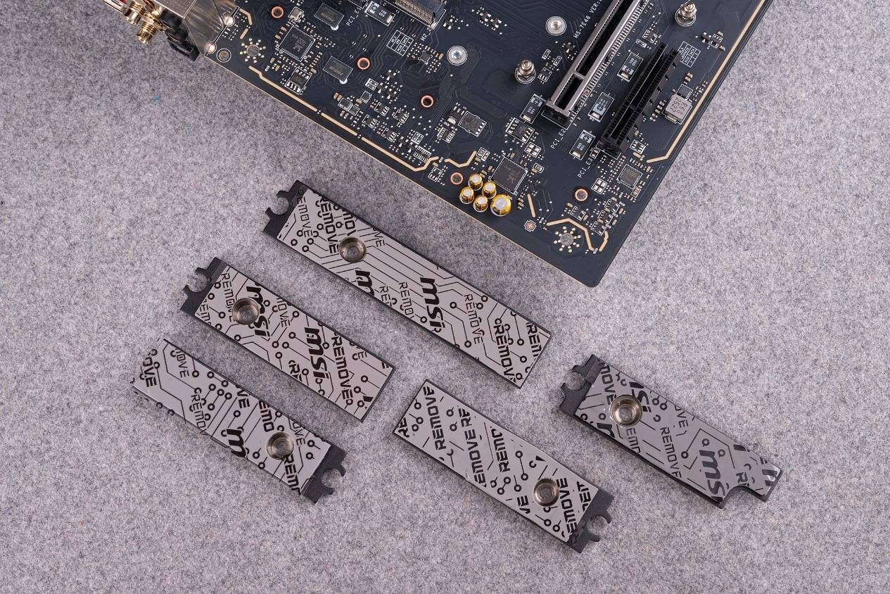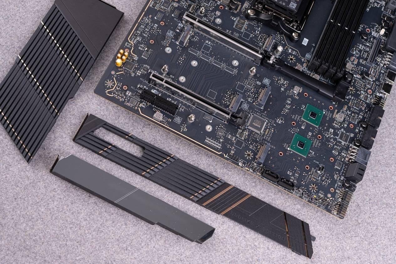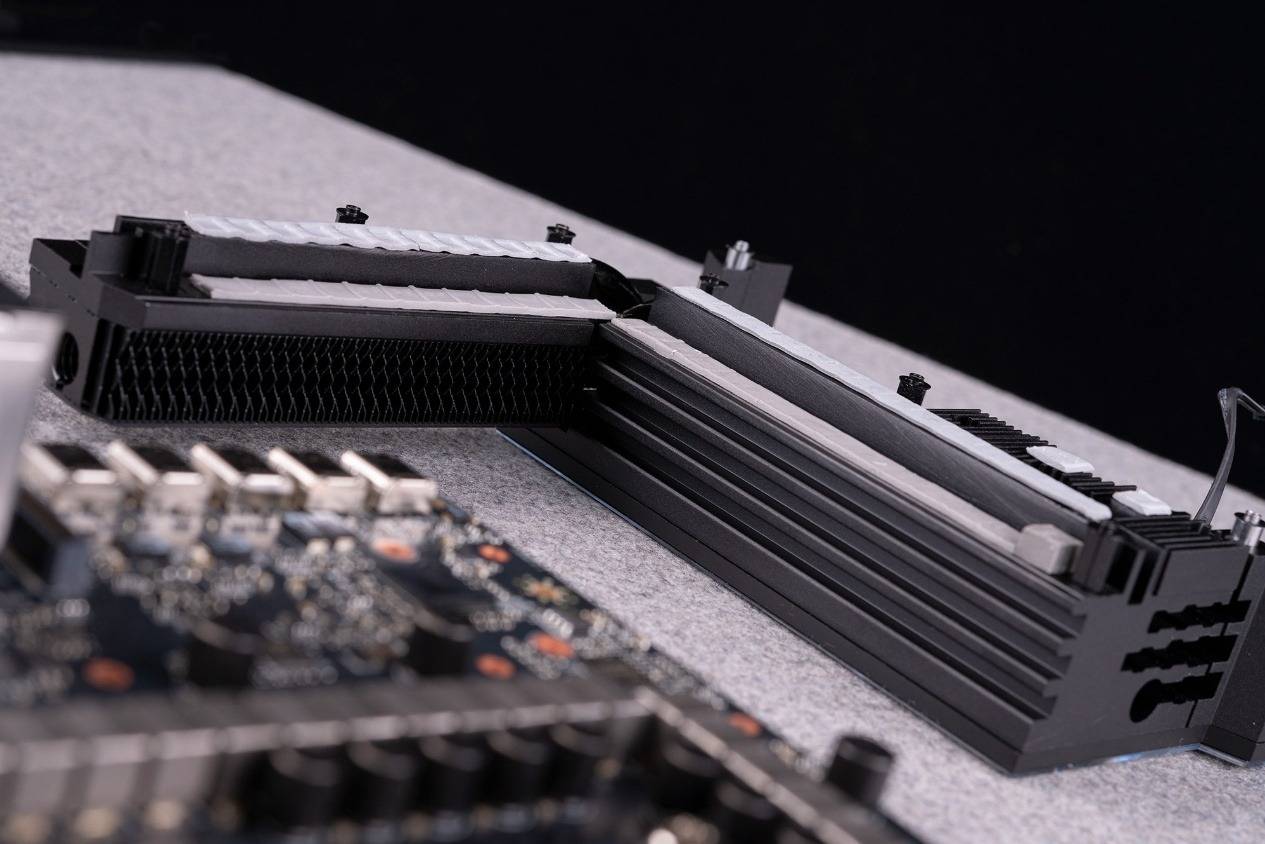除此之外,其他的M.2插槽则配备了一整块的散热装甲,同时也安排了相同的快拆设计,并且所有的M.2插槽都配备了双面导热垫,因此无论是单面颗粒还是双面颗粒的SSD,都能得到很好的散热。