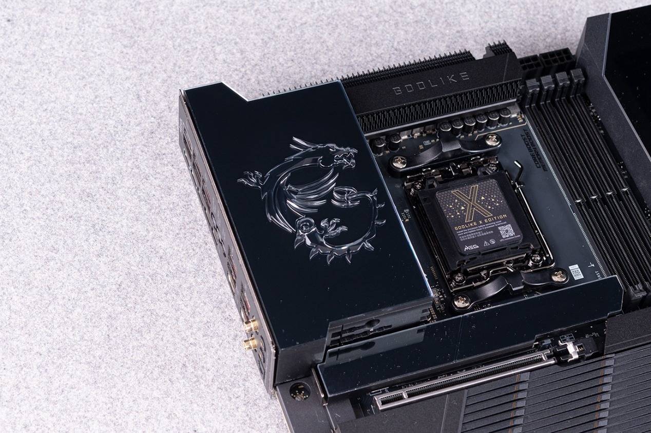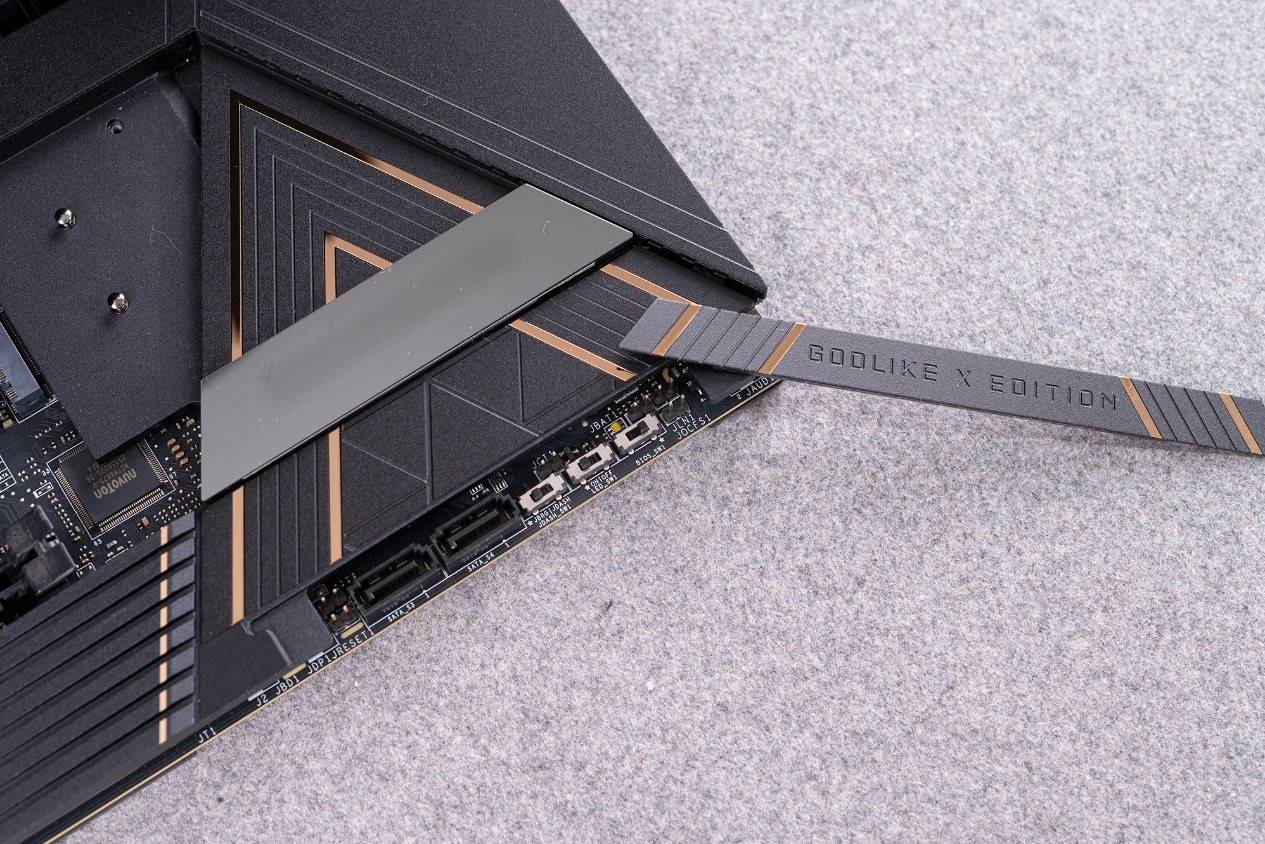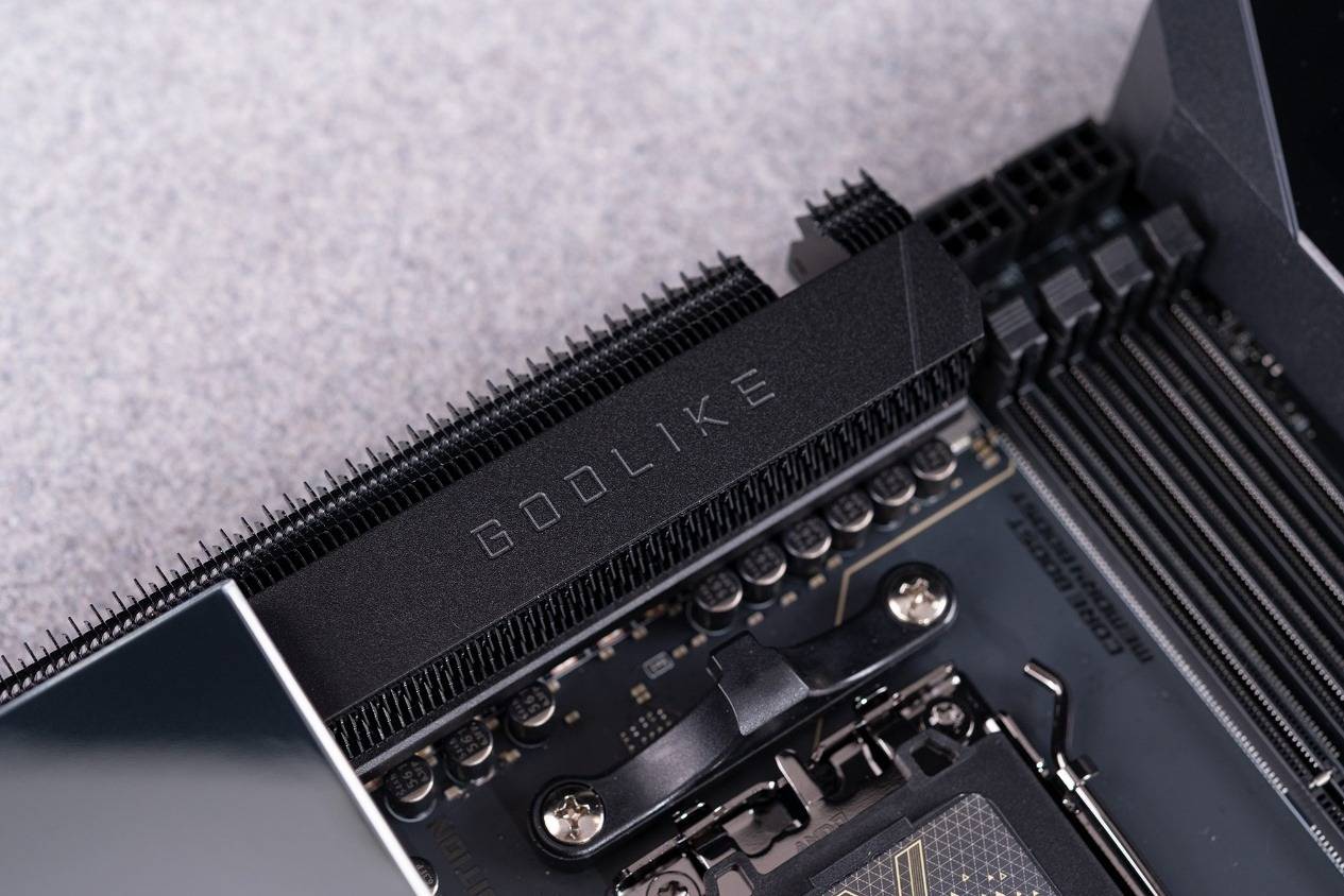 微星MEG X870E GODLIKE X EDITION超神的左侧装甲以及顶部散热装甲为一体式设计,并且外观上非常抢眼,不仅有经典的龙纹还有GODLIKE标识。
