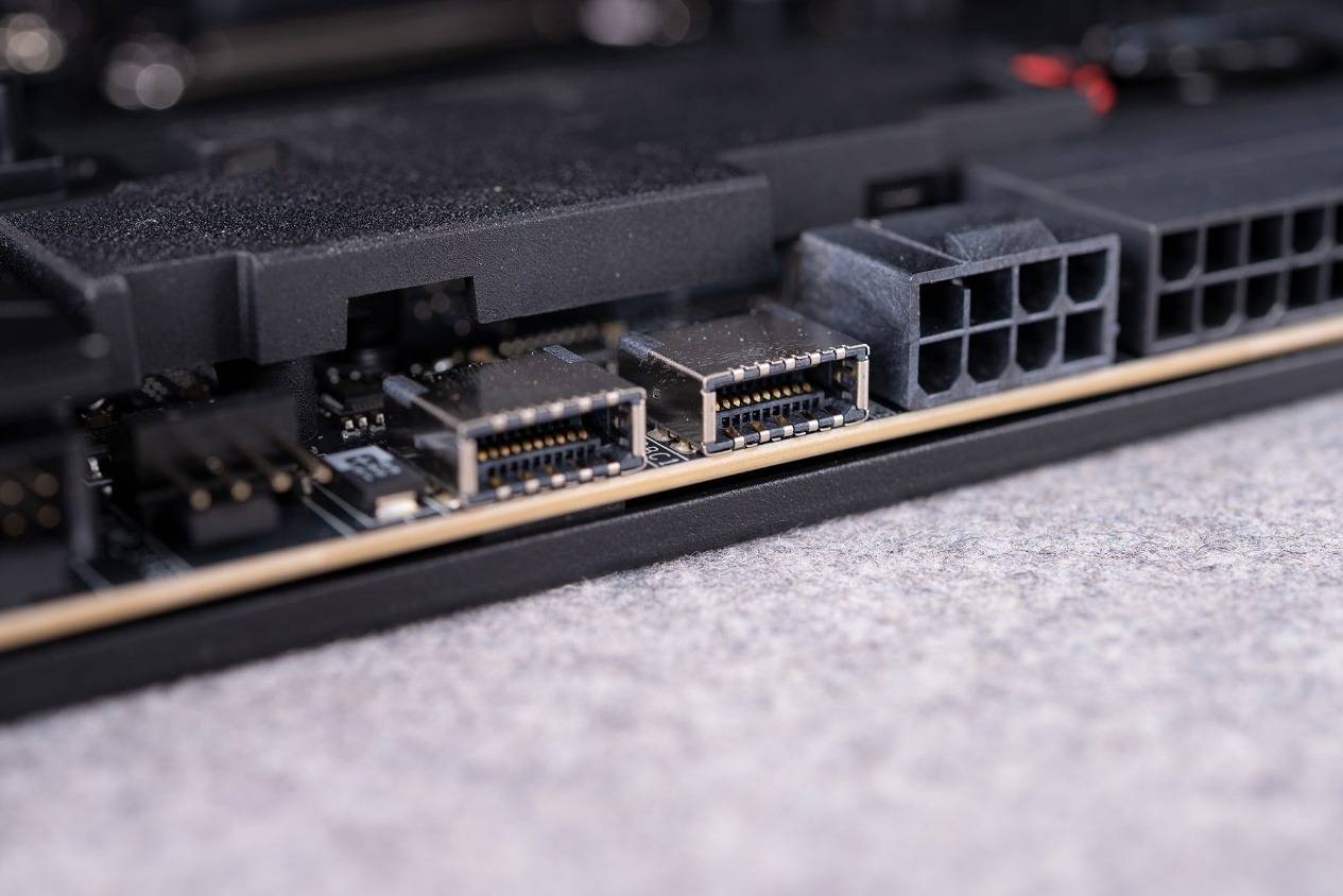 继续往右可以看到两个主板前置的Type-C接口,分别是USB 3.2 Gen2 Type C(10Gbps)速率以及USB 3.2 Gen2x2 Type C(20Gbps)速率,其中这个前置USB 20Gbps接口还提供PD快充,但需要接上旁边的8pin PCIe供电接口来实现。