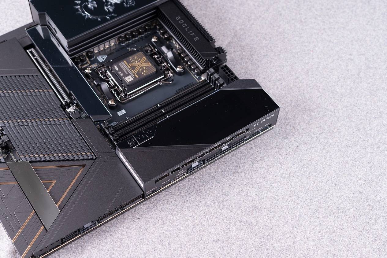 在DDR5内存插槽的旁边则是全新的第三代龙魂动态面板,用过之前Z790或X670E超神主板的玩家应该对这个有印象,其能够提供更多的玩法和个性展示空间,不过那代面板都是通过一条数据线来和主板连接,有些不够方便。