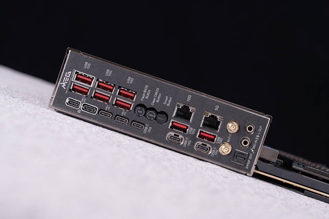 至于背部的I/O接口,微星MEG X870E GODLIKE X EDITION超神同样也是拉满了,提供了15个USB接口,并且都是USB 3.2 Gen 2速率,非常夸张!这其中包含了8个USB 3.2 Gen2 Type A(10Gbps)接口,5个USB 3.2 Gen2 Type C(10Gbps)接口,还有两个USB 40Gbps Type C接口。