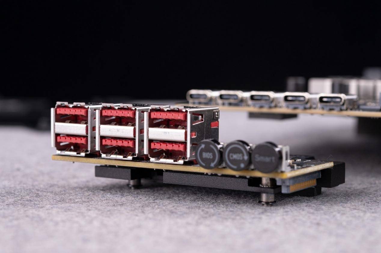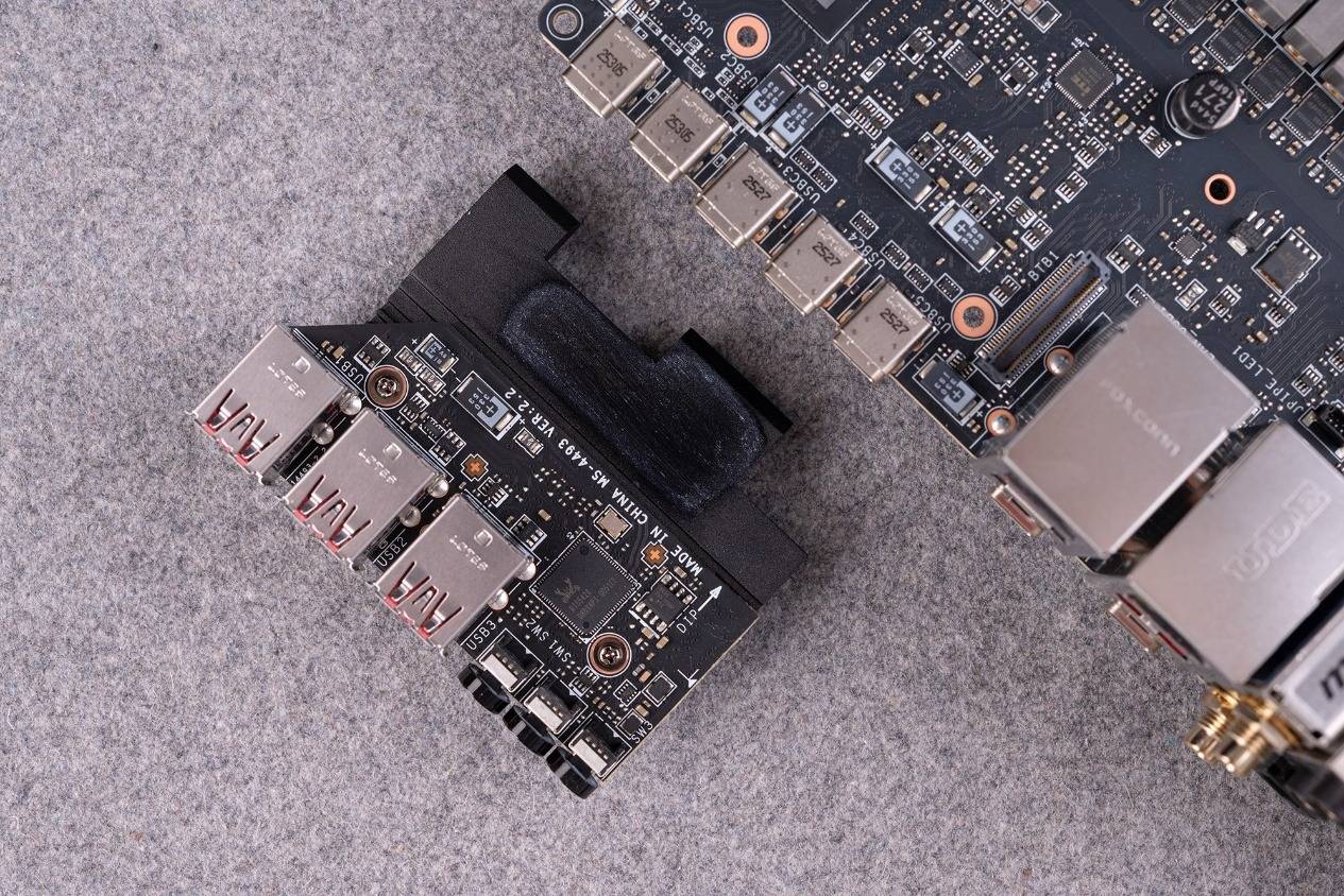另外,我们也对这款主板的I/O部分进行了拆解,发现其USB接口采用了双层PCB设计,靠上的6个USB-A接口和3个刷BIOS、清除CMOS和Smart Button按钮整齐地被焊在一块小板上。