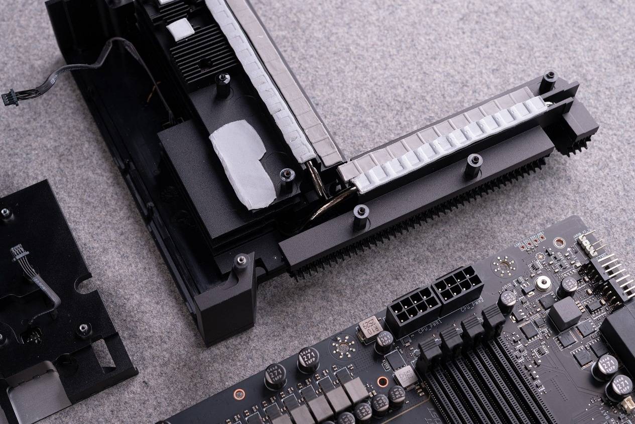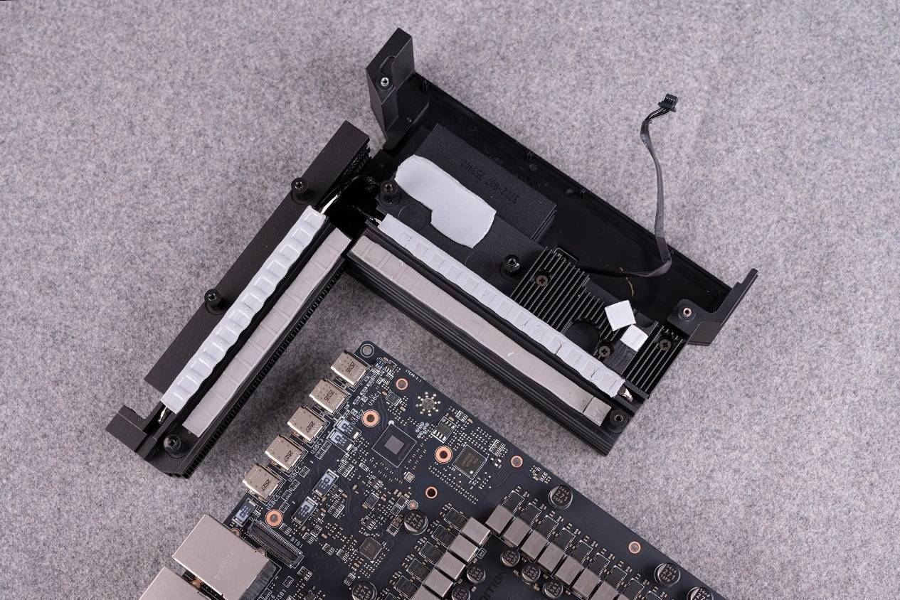 取下散热马甲可以看到其份量非常重,由两条交叉式热管连接,且热管直接接触DR.MOS,配合9W/MK的导热垫,帮助供电模块在高负载下也能稳定运行。