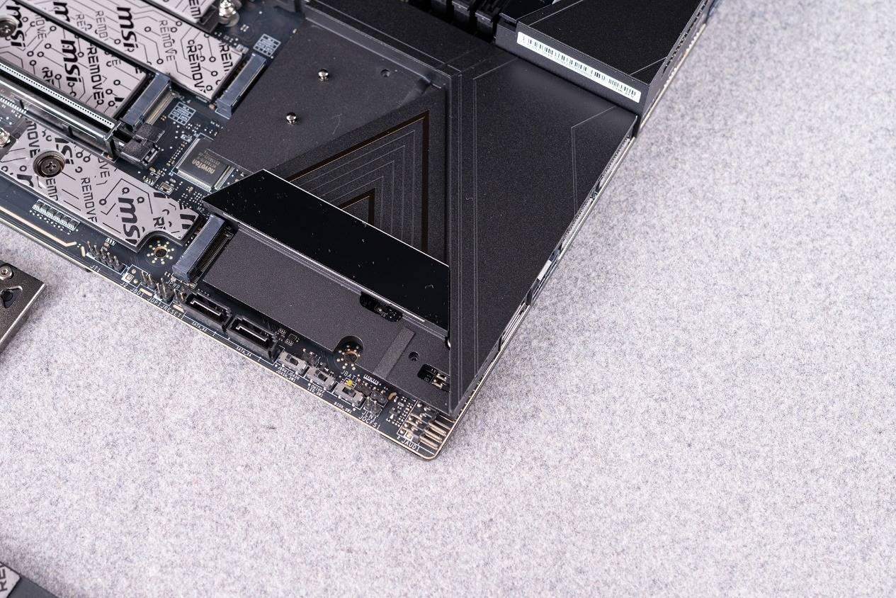 除了五个原生的M.2固态硬盘插槽外,微星MEG X870E GODLIKE X EDITION超神还提供了4个SATA 6Gbps接口。其中两个隐藏在主板底部,将其磁吸的马甲去除即可看到。