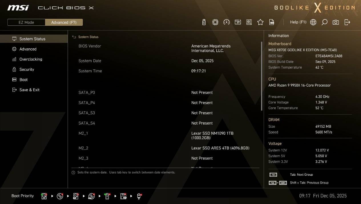 其中在System Status菜单可以看到主板的信息,例如哪个M.2接口接入了硬盘,名称是什么,能够随时掌握硬件状态。Advanced菜单则是进阶的设置选项,这里能够进行PCIe进行拆分,开启Re-Size BAR、关闭核显等操作。