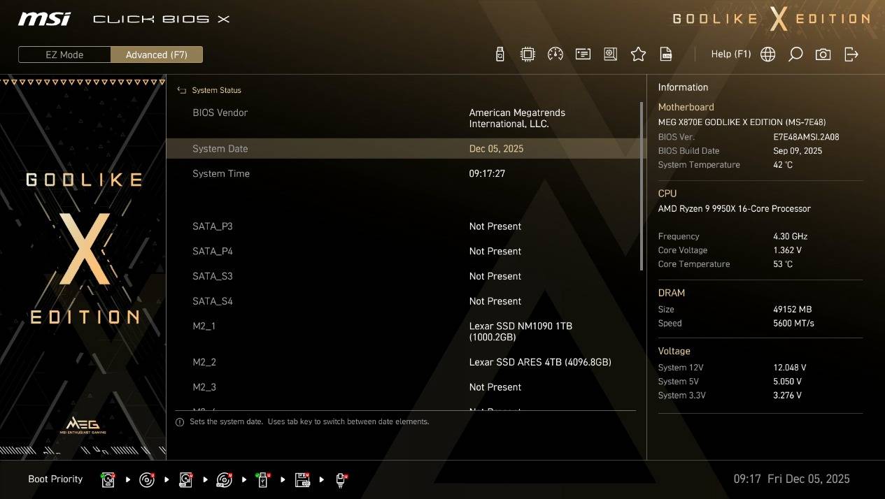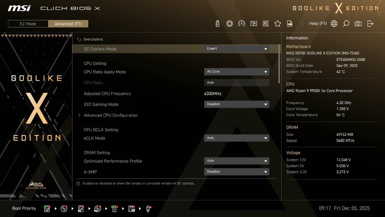 硬件看完,就该轮到软件了。微星MEG X870E GODLIKE X EDITION超神的BIOS界面与我们测试过的其他微星800系主板一样,均采用了全新的CLICK BIOS X,背景颜色使用了MEG系列独有的金色,看着还是很霸气的。并且还有GODLIKE X EDITION的专属标识!