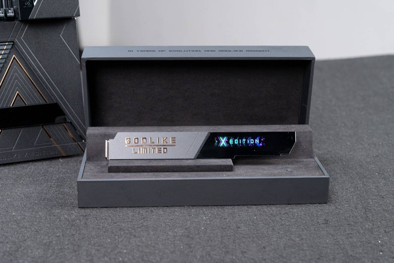 配件中像眼镜盒一样的物件则是收藏展示底座,微星为MEG X870E GODLIKE X EDITION超神主板配备了专属的固态硬盘散热装甲,其可以与这个展示底座一并使用,妥妥的限定版手办,并且正式版在固态硬盘的散热装甲上还会有全球限量1000片的独立序号,绝对的豪华吸睛。后续在RGB展示部分我们也会给大家看看它的颜值,还是非常亮眼的。