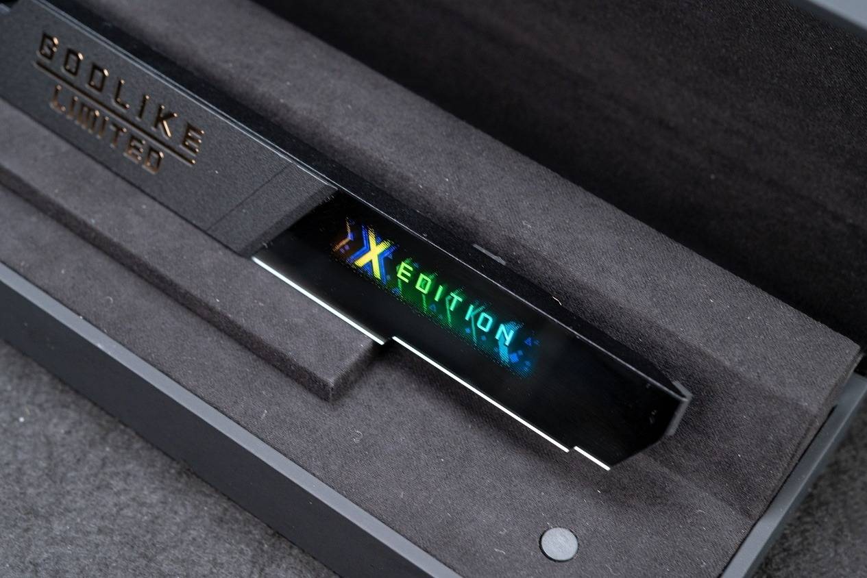 另外,这个M.2散热装甲还可以搭配配件中的底座进行展示!左侧烫金的GODLIKE LIMITED字样加上右侧律动的屏幕,无时不刻不在散发出尊贵超然之气。