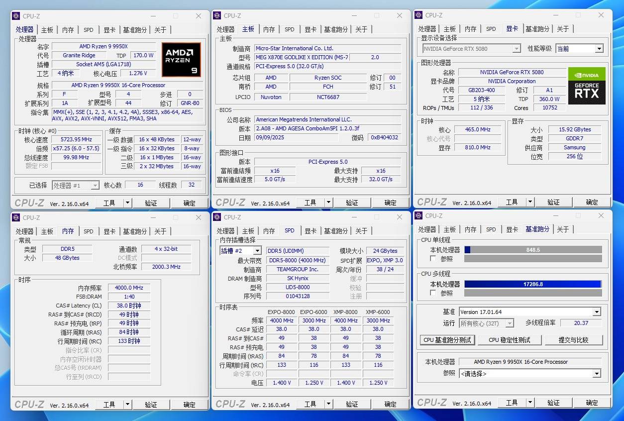 上机后,我们还是先在CPU-Z中看看平台硬件信息,同时也可以对处理器进行一定的性能测试。主板为上面提到的微星MEG X870E GODLIKE X EDITION超神,支持PCIe 5.0标准。性能释放方面,实测9950X跑出了单核848.5,多核17286.8的成绩,看来这款主板的供电配置确实出色,完全能够胜任带动9950X的重任。