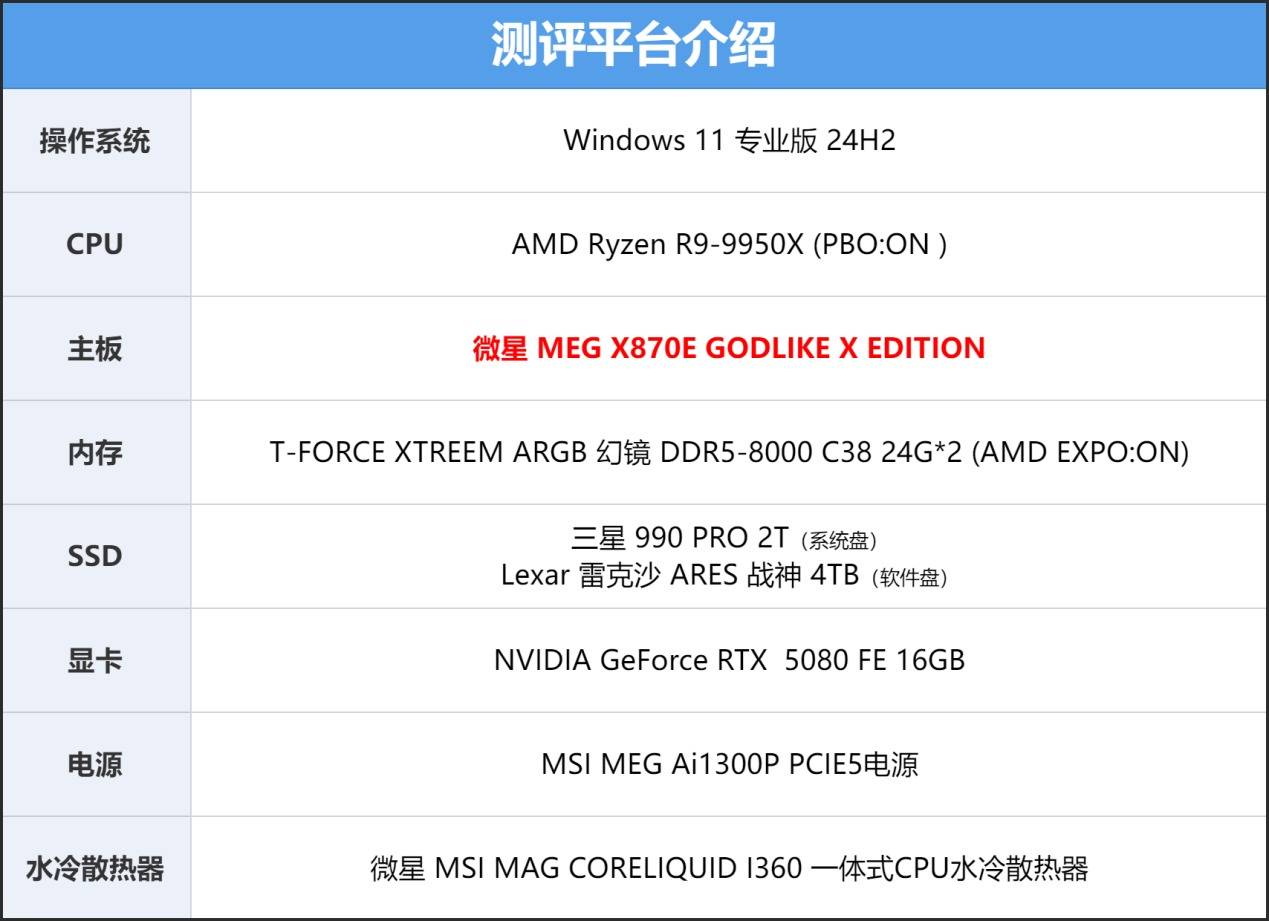 开始测试前,照例介绍一下本次的测试平台,为了发挥微星MEG X870E GODLIKE X EDITION超神的最佳效能,我们用的是目前AMD的旗舰级处理器 9950X!内存则是两根24GB DDR5-8000组成48GB双通道。至于电源方面,我们这里用的是微星推出的MEG Ai1300P PCIE5电源,一款完全符合PCI-E 5.1和 ATX 3.2电源规范的高功率电池,可以为测试平台提供充足供电。