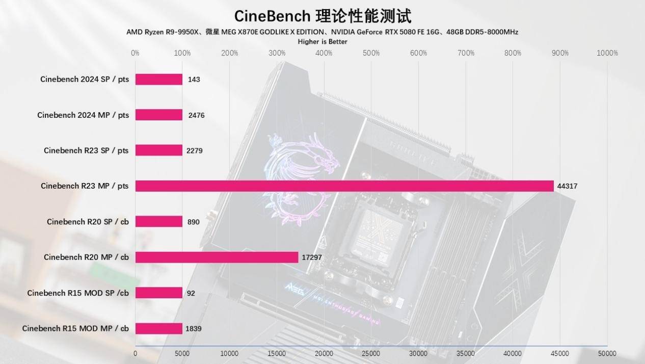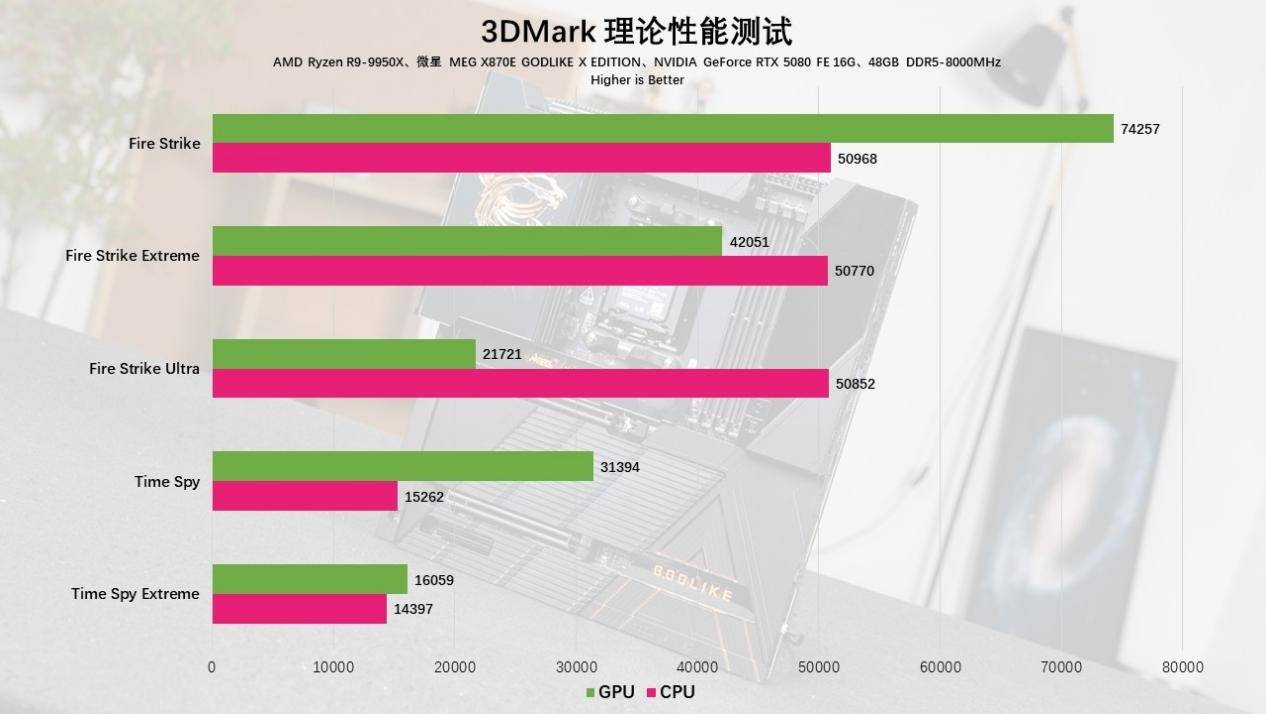 紧接着我们还测试了3DMark的理论性能,无论是在DX11的Fire Strike项目,还是DX12的Time Spy项目,成绩均相当优秀,特别是在Fire Strike中,9950X的成绩直接突破5W分大关,不得不说微星MEG X870E GODLIKE X EDITION超神出色的供电配置才让这颗顶级神U有了不错的性能释放空间。