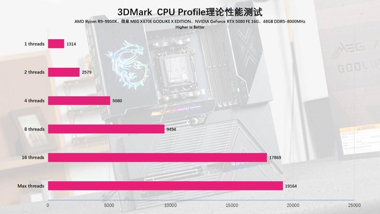 同时我们还加测了3DMark的CPU Profile项目,这里可以看到处理器各个线程数下的表现,实测9950X单线程得分1314,16线程下得分17869,最大线程得分则来到了19164,直接接近2W大关,还是非常给力的。