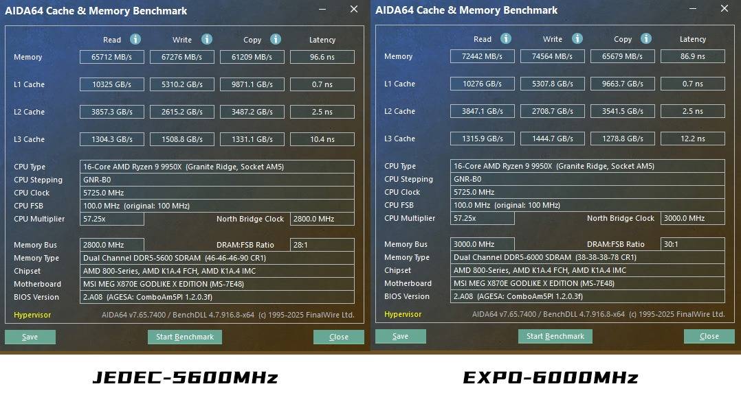 首先我们看看默认JEDEC-5600MHz的表现,此时内存的读取为65712MB/s,写入为67276MB/s,复制为61209MB/s,延迟是96.6ns。因为锐龙7000或锐龙9000处理器的内存甜点频率在6000MHz左右,因此这里我们也是开启了EXPO设定,将内存超频至DDR5-6000MHz C38。此时读取72442 MB/s,写入74564 MB/s、复制65679 MB/s,甚至延迟也不错,仅86ns。