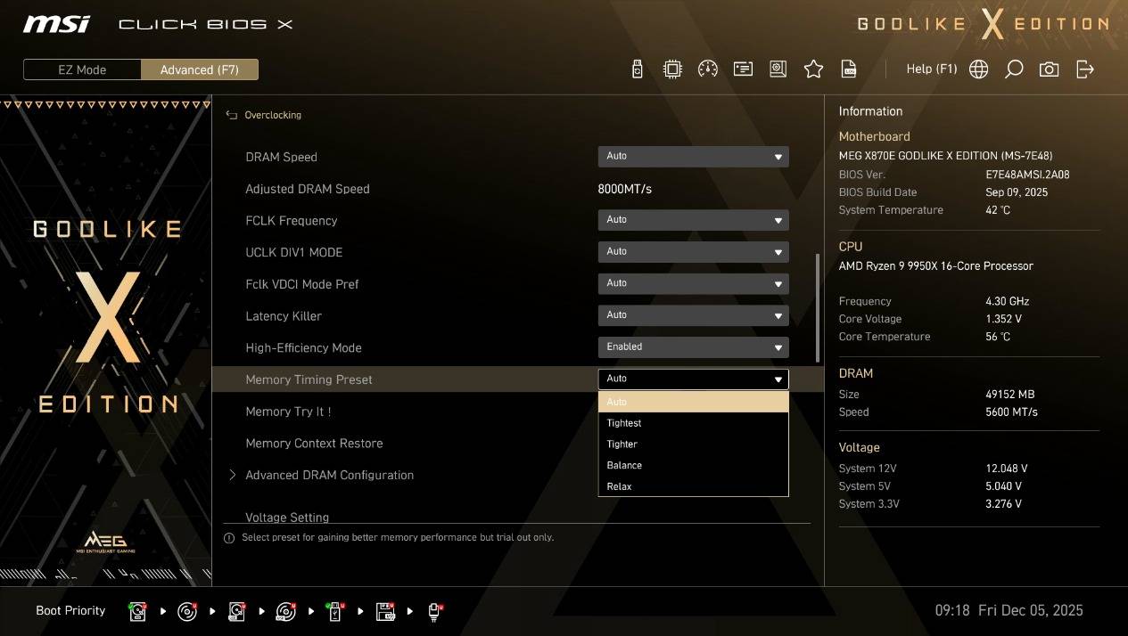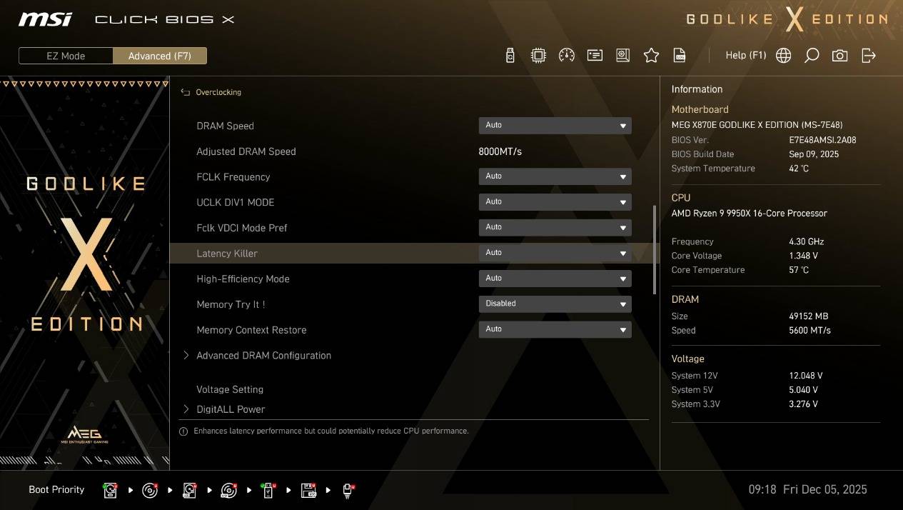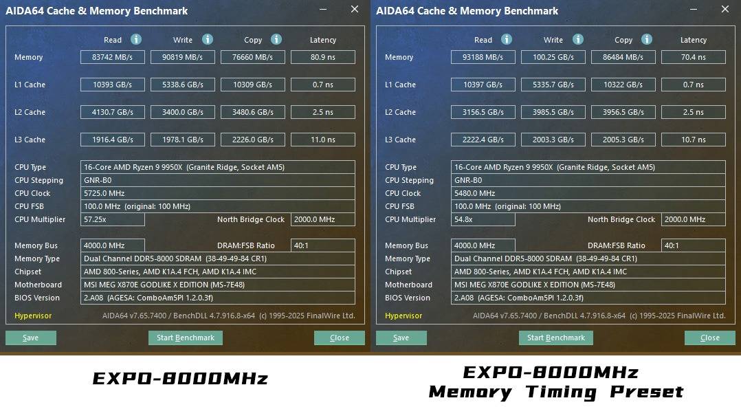 实测在微星MEG X870E GODLIKE X EDITION超神上可以轻松达成EXPO-8000MHz的成绩,并且成绩还都不错,此时内存的读取性能达到了83742MB/s,写入也有90819MB/s,复制则为76660MB/s,延迟也优化至80.9ns。开启High-Efficiency Mode,将Memory Timing Preset调整至Tighter档位后,这套EXPO-8000MHz内存的读取达到93188MB/s,写入达到100.25GB/s,复制则是86484MB/s,延迟则得益于Latency Killer,降至70ns,各项成绩均有大幅提升!