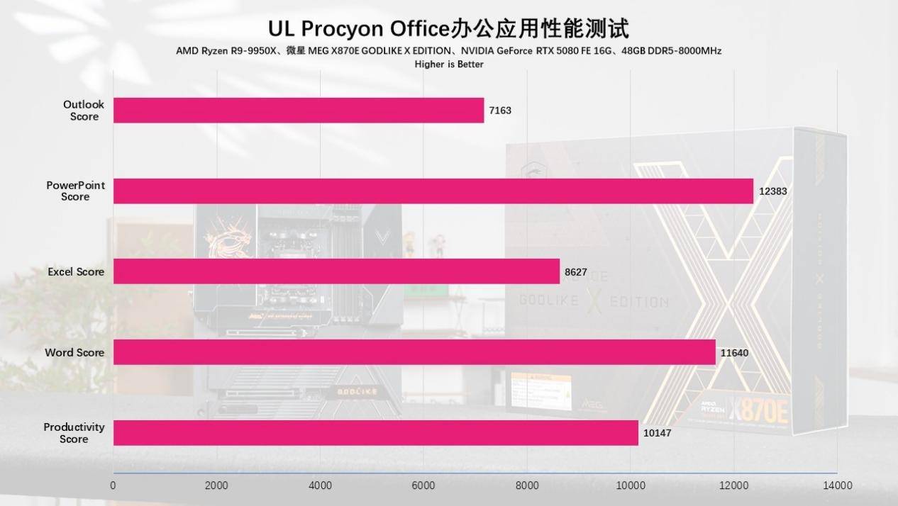 作为旗舰级创作平台,微星 MEG X870E GODLIKE X EDITION超神主板的实际应用表现同样拉满。首先是办公场景测试,我们选用 UL Procyon 进行专业评估,平台最终斩获 10147的高分,其中 Word 11640 分、Excel 8627 分、PPT 12383 分、Outlook 7163 分,即便是多文档并发、复杂数据运算、高清演示文稿编辑等高强度办公负载,也能实现秒开秒存、流畅无卡顿,完美适配专业用户的高效办公需求。