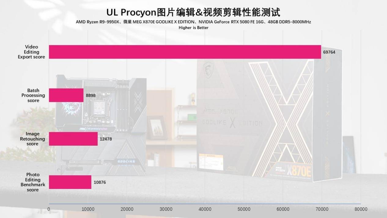 进阶图像视频创作环节,这套旗舰平台的性能彻底爆发,展现出碾压级优势。视频剪辑单项狂揽 69764 分的恐怖成绩,无论是 8K 素材剪辑、多轨道特效叠加还是复杂转场渲染,都能大幅压缩等待时间;基础图像编辑也拿下10876分,轻松驾驭 RAW 格式修图、大尺寸海报设计等专业场景,创作效率直接拉满。