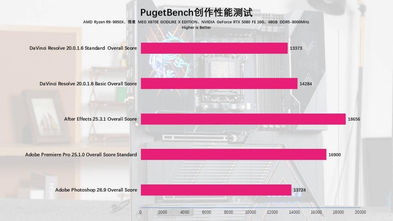 影像创作专项测试中,我们采用 PugetBench 进行实战检验,涵盖 Photoshop、PR、AE、LR 等主流 Adobe 软件,测试场景完全贴合专业创作者的真实使用习惯。依托微星 MEG X870E GODLIKE X EDITION超神主板的旗舰级供电调校与硬件协同优化,平台在轻度图像处理、重度视频剪辑、三维特效合成等全场景中均实现高分通关,无论是素材导入速度、实时预览流畅度还是最终渲染效率,都达到专业工作站级水准,完美解决创作者的性能痛点。