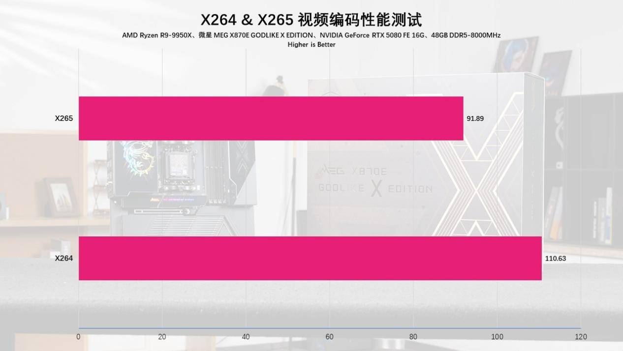视频编码环节,锐龙 9 9950X 的海量核心线程与微星 MEG X870E GODLIKE X EDITION超神主板的旗舰级24+2+1相数字供电模组形成强势协同,X264 项目实测达 110.63 fps,X265 项目也稳定输出 91.89 fps,无论是批量视频转码、直播推流还是 4K/8K 视频导出,都能以行业顶尖速度完成,丝滑无卡顿的体验让专业创作更专注创意本身。