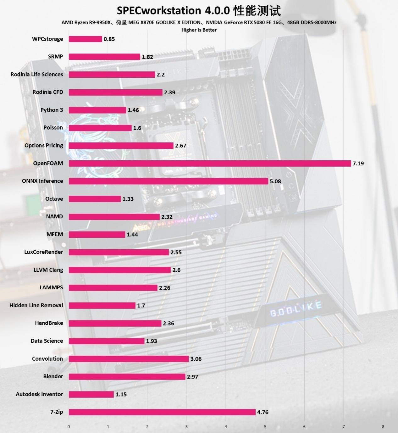 最后是 SPECworkstation 4 全方位测试,该软件通过 30 + 专业工作负载,全面考核 CPU、图形性能、I/O 带宽与内存吞吐量,覆盖媒体娱乐、金融服务、产品开发、生命科学等多领域专业场景。实测这套旗舰平台在全类别工作负载中均斩获顶级高分,充分印证了微星 MEG X870E GODLIKE X EDITION超神在专业生产力场景下的全能实力,无论是复杂仿真计算、大规模数据处理还是专业图形设计,都能提供稳定且极致的性能支撑,堪称专业工作站级装机的终极标杆。