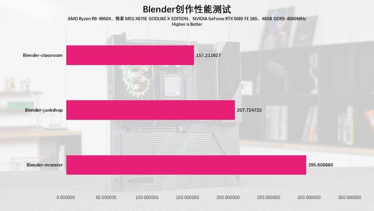 渲染性能方面,搭载锐龙 9 9950X 的微星 MEG X870E GODLIKE X EDITION超神主板平台同样表现炸裂。在 Blender 三大场景渲染测试中,凭借主板对 CPU 性能的极致释放、高速 PCIe 5.0 通道与内存超频优化,渲染速度快且稳定,复杂模型与光影效果的计算效率远超同级;若搭配顶级专业显卡,更能解锁 GPU 加速渲染的高阶潜力,进一步刷新渲染效率天花板。
