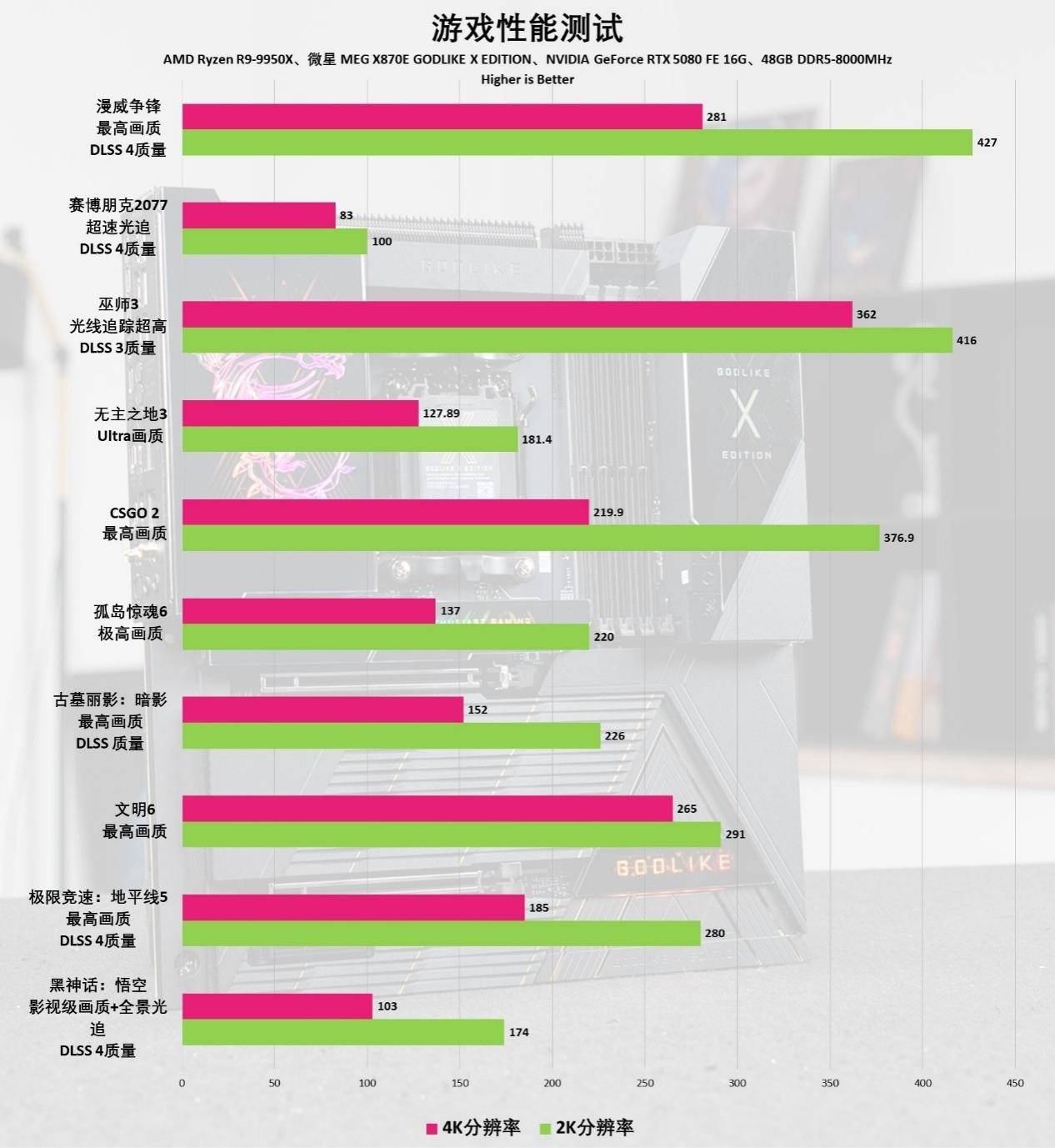 对于追求极致体验的硬核玩家而言,游戏性能无疑是核心诉求。我们精选多款重磅 3A 大作,针对 2K、4K 双分辨率展开专项测试。实测微星 MEG X870E GODLIKE X EDITION 超神主板,展现出旗舰级的极致性能与稳定性,将锐龙 9 9950X 处理器与 RTX 5080 显卡的硬件潜力压榨到极致。多款 3A 大作在 2K 分辨率下轻松突破 240Hz 高刷阈值,带来丝滑到极致的竞技体验;即便是 4K 高画质满负载场景,也能稳定锁定 144Hz 满帧输出,画面流畅度无出其右。对于打算搭载锐龙 9000 系处理器打造发烧级旗舰主机的玩家来说,这款主板在性能释放、稳定性与扩展性上均达到行业顶尖水准,堪称高端装机的性能天花板与无出其右的终极之选。