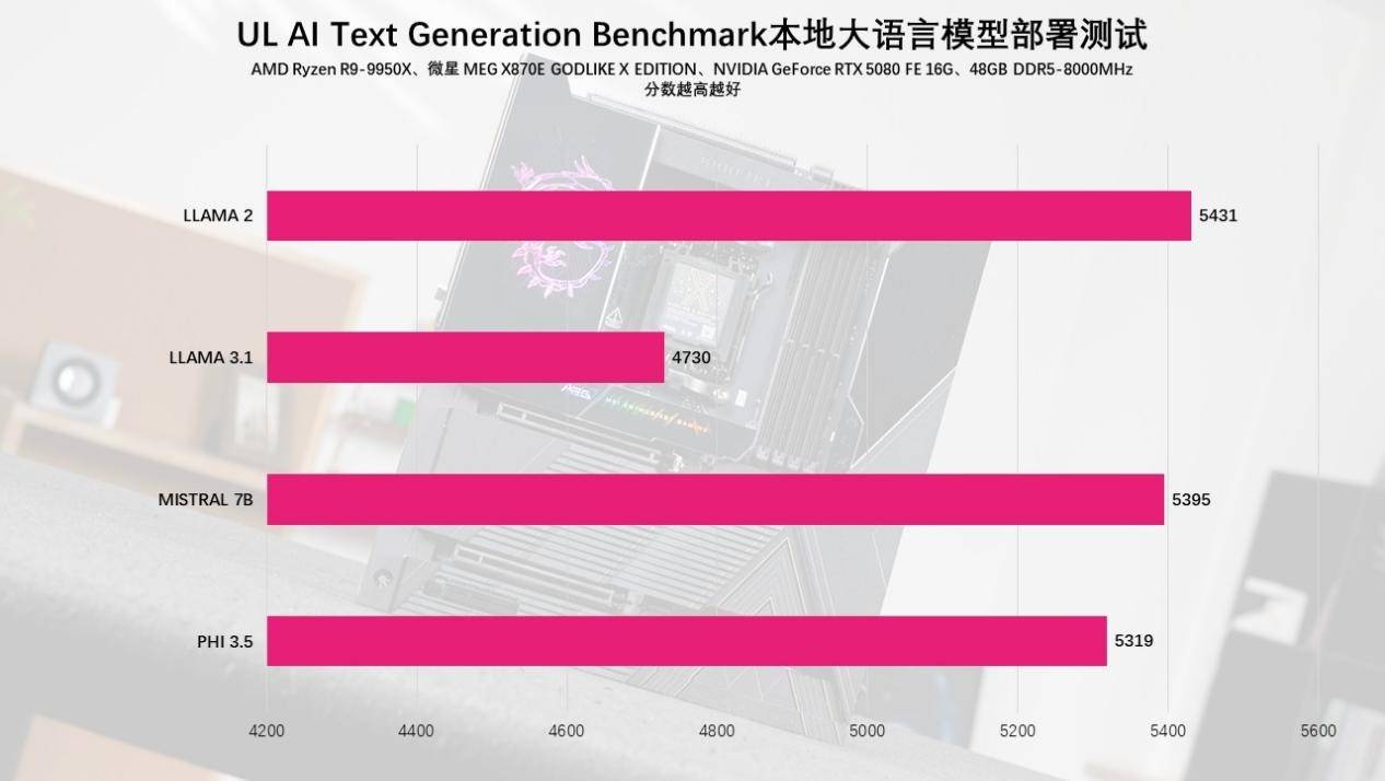 游戏过后,我们再来看看目前异常火热的AI应用表现,先来点简单的,这里我们测试了UL Procyon的AI Text Generation Benchmark,该测试会使用四款本地大语言模型,实测这套平台分别得分为LLAMA 2:5431分;LLAMA 3.1:4730分;MISTRAL 7B:5395分;PHI 3.5:5319分。