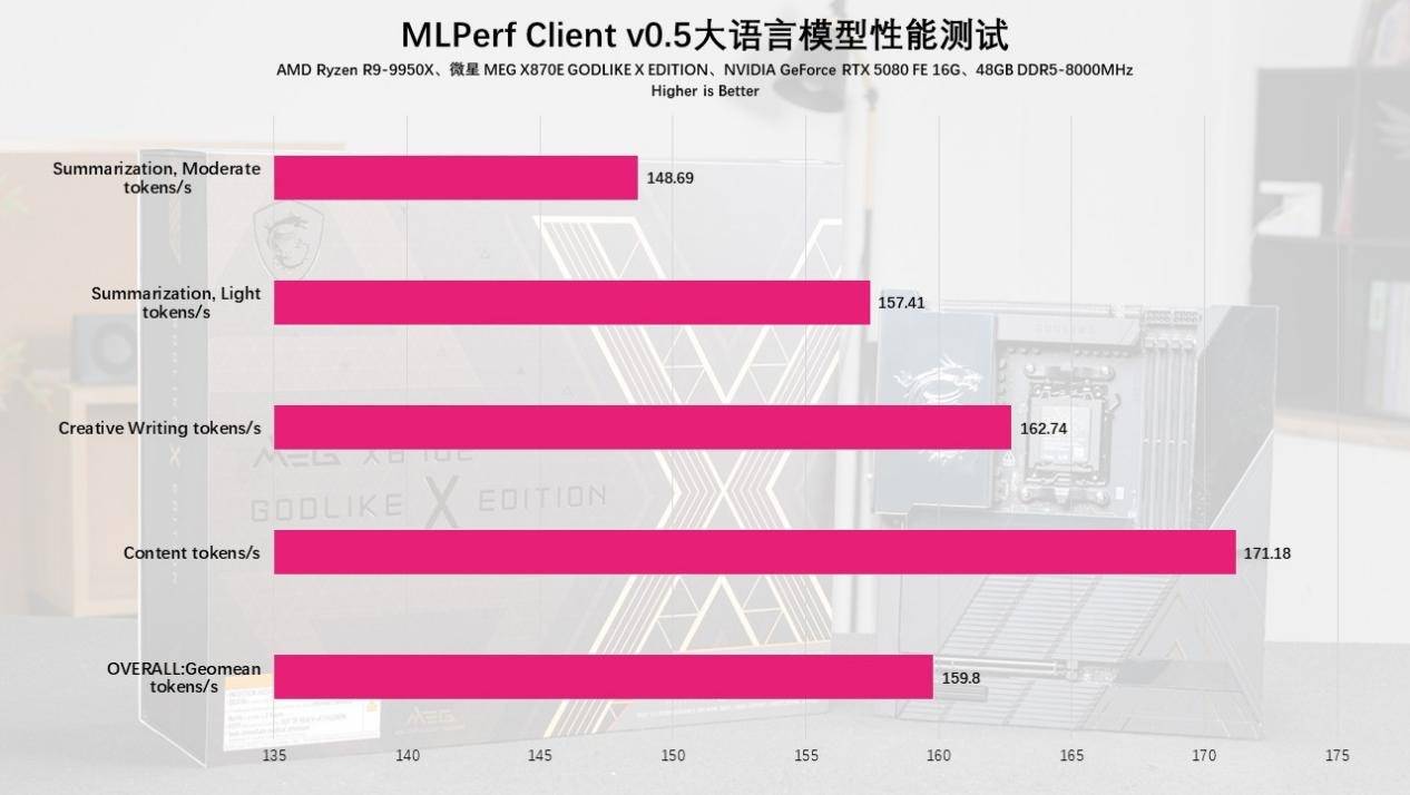加大难度,我们还用MLPerf Client v0.5大语言模型进行,该模型基于meta的Llama 2 7B开源LLM打造,涵盖了内容生成、创意写作以及对不同长度文本进行总结摘要等四项AI任务。实测这套平台还是非常强势的,各项得分都非常出色,本地大语言模型在响应上也非常快。
