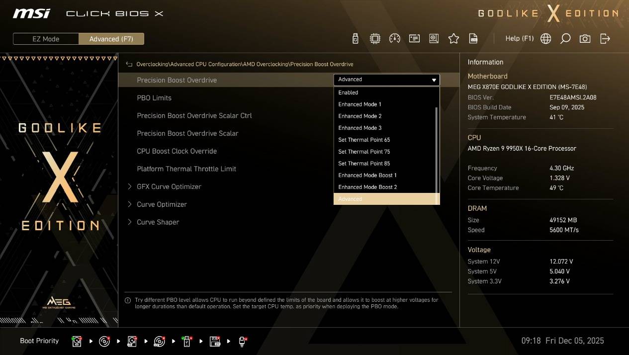 评测的最后我们再来看看这款主板的CPU供电能力,这里就不得不请出微星MEG X870E GODLIKE X EDITION超神的PBO设置了。众所周知,AMD超频最简单的方式就是开启PBO,不过微星也为大家带来了一些不同的PBO设置,在BIOS中即可找到这些预设,共分为三种类型,其中包含三档随数字增大而逐渐激进的Enhanced Mode,三档预设温度墙的Set Thermal Point,以及两档最激进的Enhanced Boost Mode。