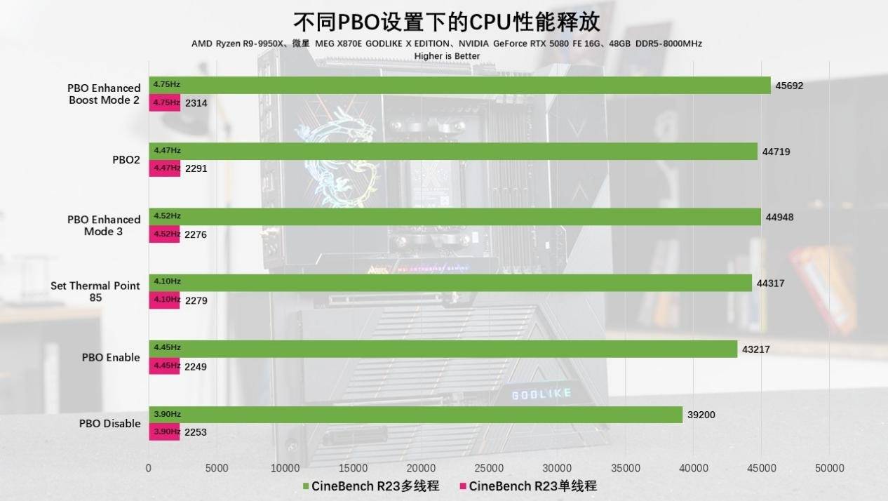 至于跑分性能释放上,默认档位自然是最低的,其次则是PBO设置,进而则是Set Thermal Point 85,再往上则是PBO2以及PBO Enhanced Mode 3,最激进的则非PBO Enhanced Boost Mode莫属,它是唯一一个单核超过2300分,多核冲上45000分的。如果你问我日常使用用哪个,那我的建议是,如果你的散热足够厉害,那PBO Enhanced Mode 3能够一键实现PBO2繁琐的超频设置,如果你对温度比较敏感,那Set Thermal Point 85则是温度与性能平衡的最佳甜点位,当然,如果你的CPU体质足够优秀,那必然是PBO Enhanced Boost Mode 1/2!