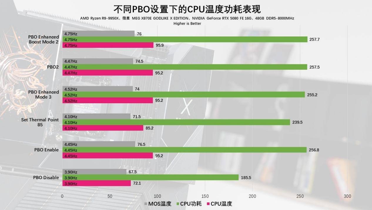 实测仅仅是开启PBO以后,9950X就已经能够全力释放了,不过此时温度也来到了95度以上,但是频率并没有很激进。而开启PBO2的话,其频率小有提升,不过温度还是不低,但是相比起默认模式还是有了不小的提升。接着如果使用PBO Enhanced Mode3进行测试,此时CPU频率能够提升至4.52Hz以上,功耗与温度则与PBO2差不多,如果追求更为极致的频率释放则可以尝试PBO Enhanced Boost Mode,我们实测其无论是功耗还是频率都比PBO2更为激进,能够冲上4.75Hz。当然如果你对温度比较敏感,那Set Thermal Point 85已经能够获得不小的提升了,并且温度也没有那么激进。