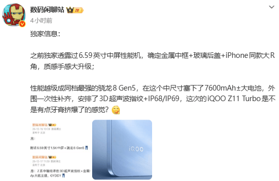 — iQOO Z11 Turbo产品细节公布,新机搭载骁龙8 Gen5及7600mAh电池 —