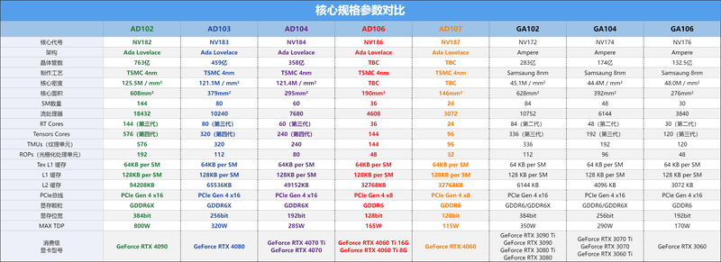 至于RTX 4060呢则是完全不同于RTX 4060 Ti的核心,其用的是AD107核心,4个GPC,不过每个GPC中仅包含4个TPC,因此SM单元总共只有24个,而CUDA则为3072个颗,L2缓存最大可至32MB,这点倒是与RTX 4060 Ti一致。