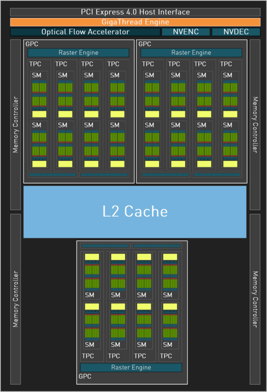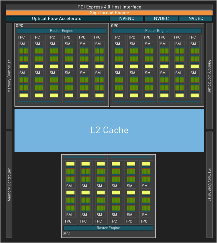 从下图可以看到,完整的AD106核心应该包括3个GPC(图形处理集群)、18个TPC(纹理处理集群)、36个SM(流式多处理器)以及一个带有6个32Bit显存控制器的256Bit显存带宽。
