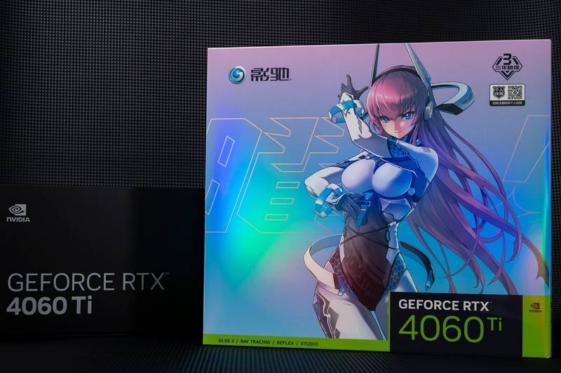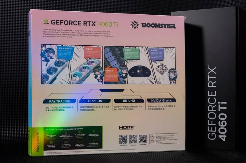 大家的“老婆“又双叒叕出现了!影驰RTX 4060 Ti 8G星曜OC的正面包装是巨幅的二次元战姬形象,机甲战士的造型既美观,又暗示盒内这张显卡的性能不容小觑,相当能打。除此之外,巨大的”曜“字Logo可以说把辨识度拉满了。
