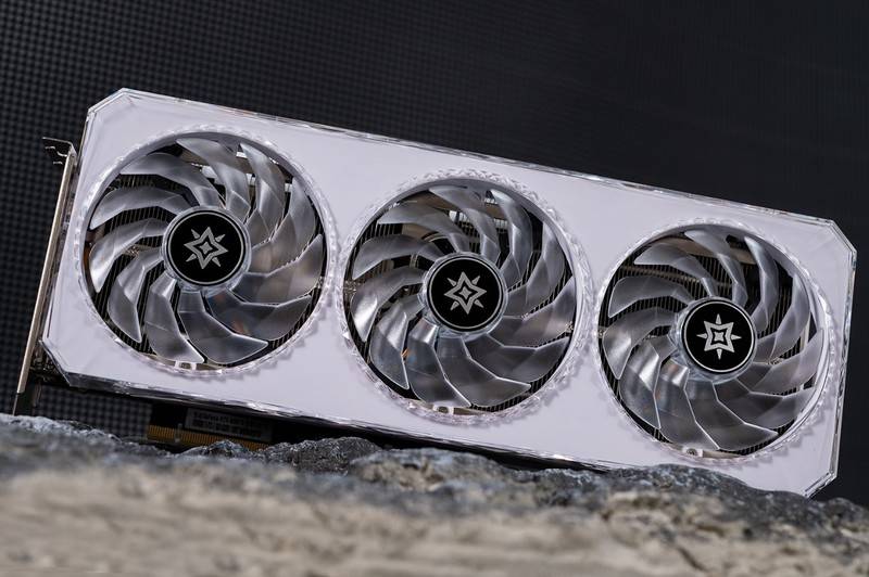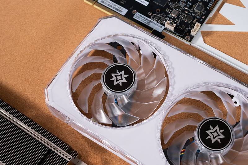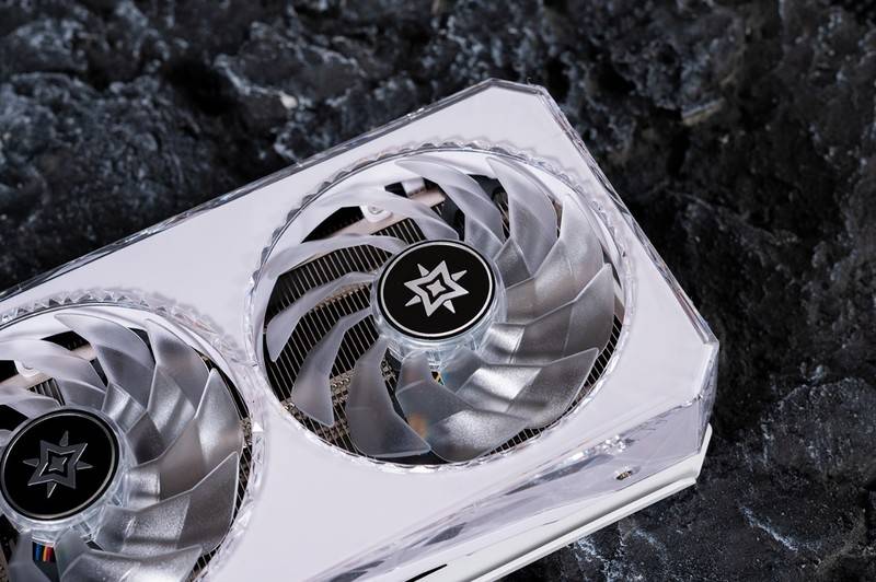 拉近看,你在散热风扇的四周还能找到一圈水晶外壳包边,颜值更上一层楼。除此之外,刚刚提到的这个纯白为底的透明上盖还可以拆卸,玩家完全可以异想天开,创作自己专属的影驰RTX 4060 Ti 8G星曜OC。