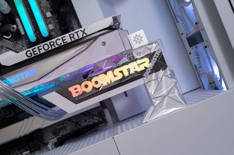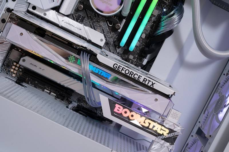 视线从后背延申至显卡顶部,上面一块通透的外壳下隐藏着“BOOMSTAR“星曜系列的信仰灯,只有显卡通电,你才能见证它的光芒。