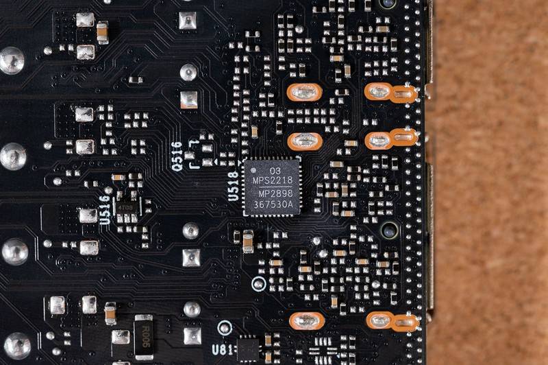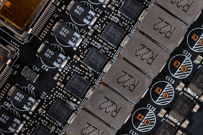 每相核心供电都采用了独立的DrMos芯片,来自MPS,型号为MPS2307,这颗MOSFET可在3.4V至75V的宽工作输入电压范围内提供23A的连续负载电流,实力还是不错的。