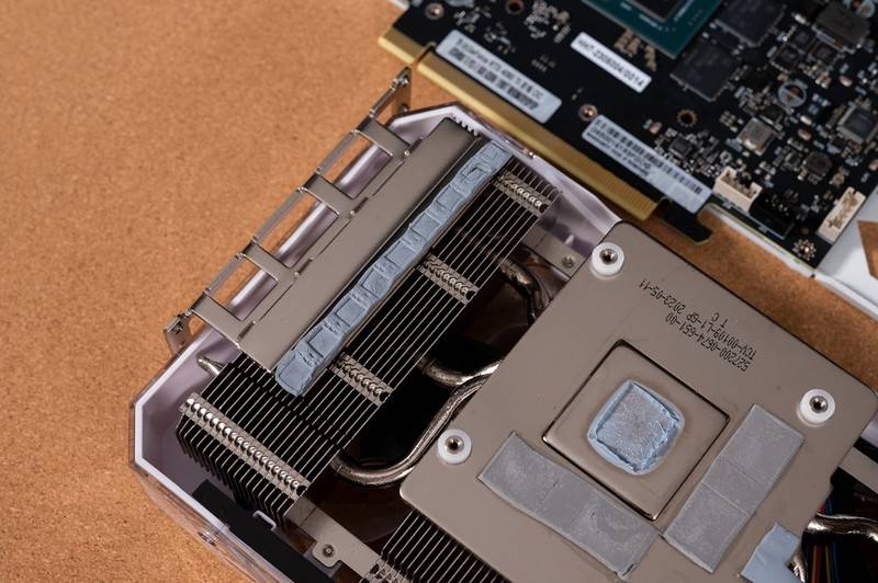 目光聚焦到影驰给这款显卡配备的星卓III散热系统,中间就是大面积的铜底,并且影驰在这之上还为显存、电感、MOS管接触的地方用上了高系数的导热垫辅助散热。