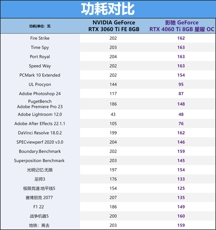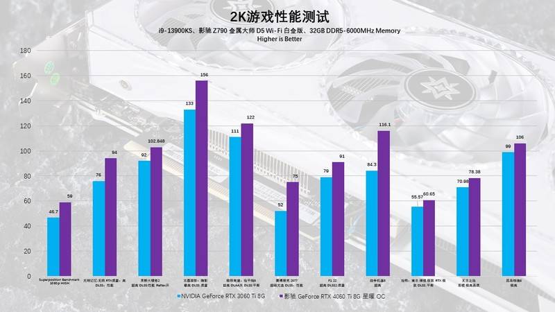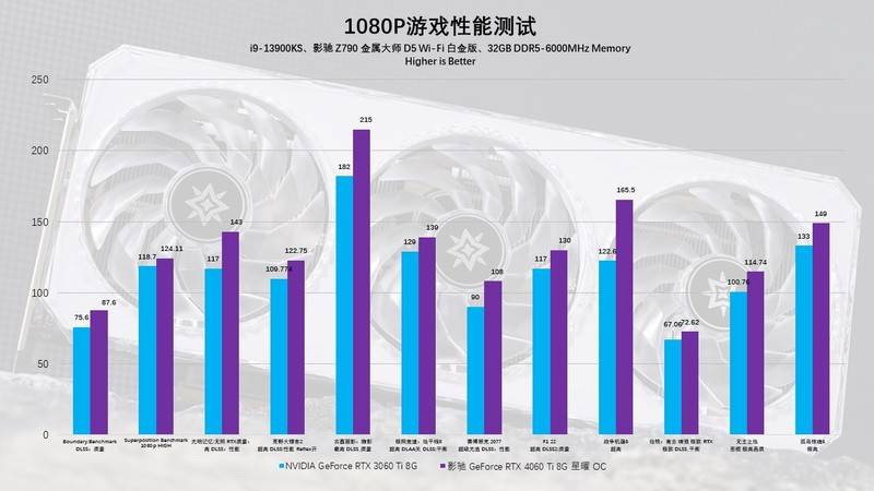 对比起前代的RTX 3060 Ti,这张影驰RTX 4060 Ti 8G星曜OC更是优势尽显,不少游戏帧数都是前者的1.2倍以上,这才是甜品级显卡应有的表现。