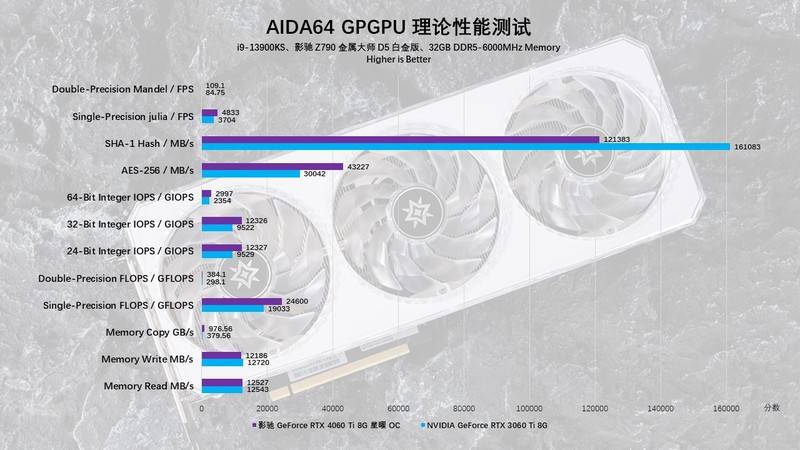 而在其他理论性能方面的测试中,影驰RTX 4060 Ti 8G星曜OC都不同程度的超越RTX 3060 Ti,例如在GPGPU理论中,拥有Ada Lovalace架构的RTX 40系列显卡在算力上也有出色的性能表现,尤其是单精度和双精度浮点运算上,提升幅度是最大的。影驰RTX 4060 Ti 8G星曜OC相比RTX 3060 Ti显卡有着巨幅提升,领先幅度足足有30%以上。