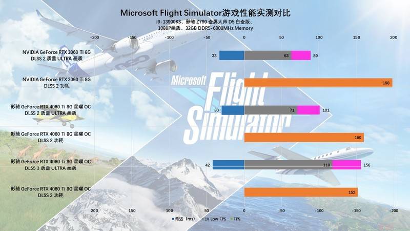 光测试理论性能肯定是不够的,现在支持DLSS 3的游戏已经上升至50款,因此我们也选用了一些热门游戏尽显详细测试。在对硬件要求颇高的《微软模拟飞行》中,影驰RTX 4060 Ti 8G星曜OC开启DLSS 3后对RTX 3060 Ti简直是降维打击,1080P分辨率下比RTX 3060 Ti高出70多 FPS。另外整个游戏过程中,影驰RTX 4060 Ti 8G星曜OC的功耗仅160W,而隔壁的RTX 3060 Ti基本在200W徘徊。用更低的功耗实现了更强的性能!这点不得不说老黄确实厉害。