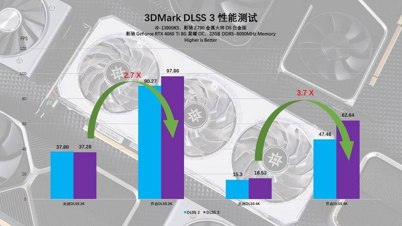 还是3DMark先跑一轮,有了DLSS 3后,影驰RTX 4060 Ti 8G星曜OC如虎添翼,2K分辨率下,开关DLSS 3性能差距能够达到2.7倍以上,帧数稳定在95 FPS以上,4K分辨率更是不得了,开关前后差距足足有3.7倍,并且从理论测试来看影驰RTX 4060 Ti 8G星曜OC有一定的4K游戏能力,完全超越了其定位。